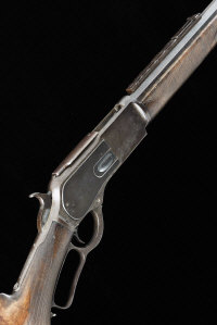 WINCHESTER AN UNUSUAL 45-75 LEVER ACTION SPORTING RIFLE, NO VISIBLE SERIAL NUMBER 28-inch octagonal barrel with replacement fore sight and Express folding ladder and leaf sights, full length magazine tube, shortened by 2 1/2-inches, the frame with sliding dust cover, 13 1/2-inch presentation quality stock with pistol grip and steel butt plate, sling swivels, 10lb. 4oz. |