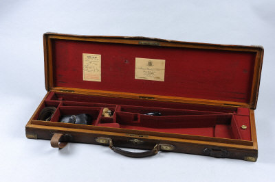 J. PURDEY & SONS A BRASSBOUND OAK AND LEATHER GUN CASE with compartment blocked for 29-inch barrels (will take 30-inch) |