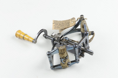 the blued steel frame with hinged side wings, bowstring broken, the sliding steel "barrel and breech" with miniature lock mechanism and rotating cocking handle, retaining much of its original blued finish overall