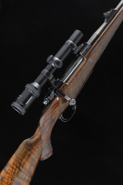 WILLIAM & SON A .375 H&H MAGNUM BOLT-ACTION SPORTING RIFLE, NO. 9010 24-inch barrel and ramp fore sight with folding moon bead and cover, the rear sight with gold lined folding leaf to 100, the barrel signed in gold, the receiver mounted with a Swarovski Habicht 1.25-4x24 telescopic sight in quick detachable swing-off mounts, magnum length bolt with side safety, recoil stud, the magazine with hinged base plate and profusely engraved with foliate scrollwork and signed by the engraver "Peter Cusack", the half length highly figured stock with pistol grip, cheekpiece and leather covered recoil pad, sling swivels, 14 3/4-inch pull, 9lb. 14oz., nitro proof S1 The rifle appears new and unused. |