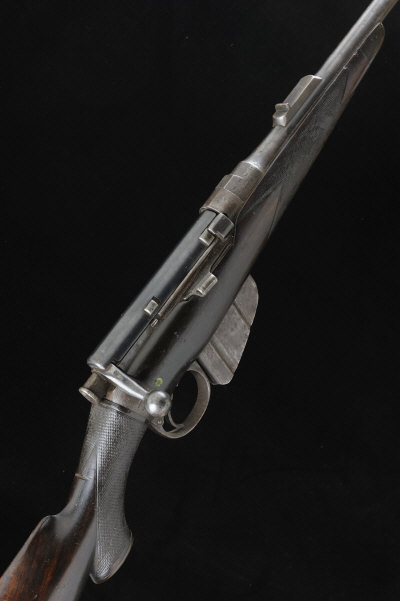24-inch barrel with raised fixed fore and rear sights, the receiver with magazine cut-off and loading gate, bolt with dust cover, detachable box magazine, half length stock with pistol grip and steel butt plate, 14 1/4-inch pull, 7lb. 8oz., nitro proof