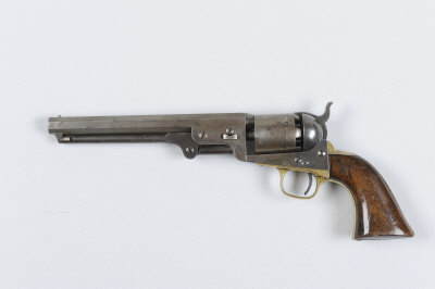 COLT A .36 1851 NAVY MODEL PERCUSSION REVOLVER, NO. 191108 7 1/2-inch barrel with New York address and London black powder proof marks, the replacement cylinder numbered to match, the frame with brass trigger guard and back strap, smooth walnut grip, worn overall, serial numbers possibly spurious S58 |