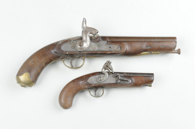 A FLINTLOCK POCKET PISTOL 4-inch barrel with plain lock and full length stock; together with a 16-bore percussion pistol, with 7 1/2-inch damascus barrel, Birmingham black powder proof (2) S58 |
