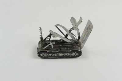 SCHUCHBAUER KISSINGEN A FINE GERMAN COLLECTOR'S KNIFE with approximately 96 different blades and functions, the black grips inlaid with silver scrollwork, the largest blade 3 1/2-inches |