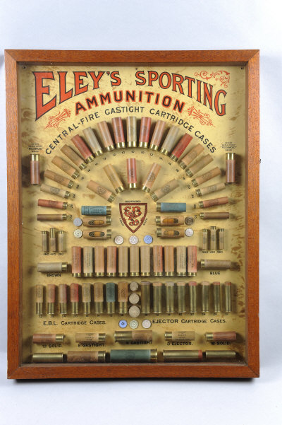 ELEY AN ATTRACTIVE SPORTING AMMUNITION CARTRIDGE DISPLAY showing an arrangement of shotgun cartridges, including sectioned examples from .360 up to 8-bore, in its glazed frame, 21 by 27-inches |