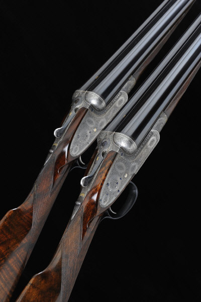 BOSS & CO. A FINE PAIR OF 12-BORE SINGLE TRIGGER ASSISTED-OPENING SIDELOCK EJECTOR GUNS, NOS. 4691/2 30-inch barrels with 2 3/4-inch chambers, the right bores fitted with interchangeable Briley choke tubes, the left barrels with about 3/8 and 1/4 choke borings, the frames, locks and gold numbered top levers with fine bouquet and scroll engraving, retaining much original hardening colour, patent single triggers, gold lined cocking indicators, rolled edge trigger guards, 14 3/4-inch highly figured stocks including 1/2-inch extensions, 6lb. 10oz., nitro re-proof, in their brassbound oak and leather case S2 The maker confirms that the guns were built in 1898 for Baron E. B. d'Erlanger. |