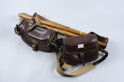 A SHOOTING SEAT the oak and leather folding tripod seat with canvas strap; together with two leather cartridge bags (3) |