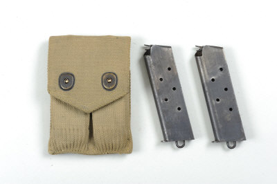 COLT A PAIR OF MAGAZINES FOR A 1911 MODEL SELF-LOADING PISTOL two-tone bodies with lanyard loops, in their canvas pouch dated June 1918 |