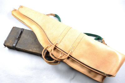 TWO LEATHER GUN SLIPS with felt lining and full length zips; together with a canvas gun case (3) |