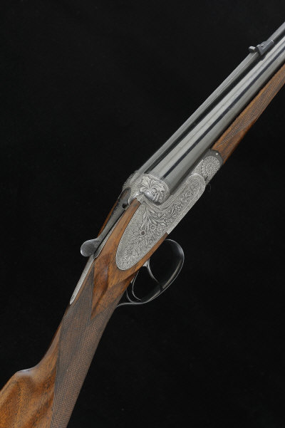 24 1/2-inch barrels with machined rib and fixed sights, mid extension, the interchangeable 25 1/2-inch 20-bore barrels with 2 3/4-inch chambers, about 1/2 and 3/4 choke borings, the bolstered frame, side plates and top lever with bold foliate engraving surrounded by fine scrollwork, clipped fences, articulated front trigger, 14 1/4-inch figured stock with rubber recoil pad, sling eyes, 7lb. 5oz., Belgian nitro proof, in a plastic case with J. Roberts label