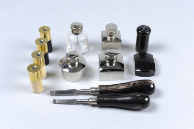 BOSS & CO. A GROUP OF GUNMAKERS ACCESSORIES comprising: 4 named oil bottles, 2 pairs of horn-bodied snap caps, a pair of turnscrews, a striker pot and snapping block |