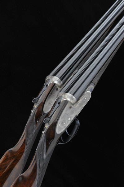 J. PURDEY & SONS A PAIR OF 12-BORE SELF-OPENING SIDELOCK EJECTOR GUNS, NOS. 15303/4 29-inch Whitworth steel chopper lump barrels with 2 1/2-inch chambers, about improved cylinder and 1/2 choke borings, the frames, locks and numbered top levers with fine bouquet and scroll engraving and retaining some original hardening colour, articulated front triggers, 14 1/2-inch well figured stocks including slim leather-covered recoil pads, 6lb. 7oz., nitro proof, in their maker's brassbound oak and leather case