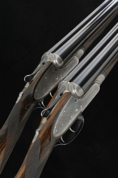 STEPHEN GRANT & SONS A PAIR OF 12-BORE LIGHTWEIGHT "TWELVE-TWENTY" SELF-OPENING SIDELOCK EJECTOR GUNS, NOS. 17071/2 28-inch chopper-lump barrels with 2 1/2-inch chambers, about improved cylinder and 1/2 choke borings, the frames, locks and gold numbered top levers with fine scroll engraving and retaining some original hardening colour, fluted fences, 14 3/4-inch highly figured stocks including leather-covered recoil pads, 6lb. 3oz., nitro proof, in their maker's oak and leather case S2 The maker confirms that the guns were built circa 1932 and are among the first guns built on the lightweight Baker action to carry the Stephen Grant name. |
