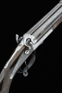 28-inch barrels, the frame, backlocks and rotary underlever with scroll engraving, 14 3/4-inch replacement stock with steel butt plate, 9lb. 4oz., black powder proof, heavily worn overall, hammers broken and repaired