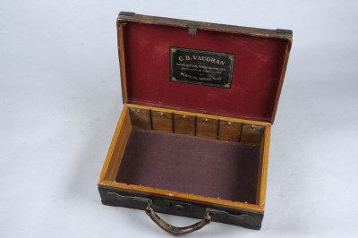 C. B. VAUGHAN A BRASSBOUND OAK AND LEATHER CARTRIDGE MAGAZINE for about 350 cases, straps and dividers missing |