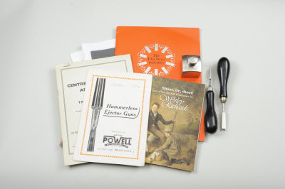 J. PURDEY & SONS A SMALL GROUP OF GUNMAKERS ACCESSORIES comprising: named oil bottle, with turnscrew and striker key; together with a small group of gunmakers catalogues, cleaning kit, etc |