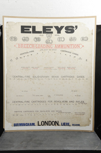 ELEY A BREECH LOADING AMMUNITION CARTRIDGE DISPLAY BACKING SHEET mounted on a board for a display of metallic sporting and military ammunition |