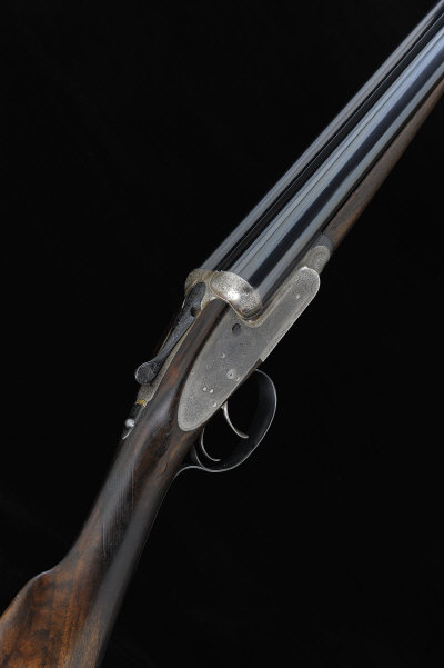 J. PURDEY & SONS A 12-BORE SELF-OPENING SIDELOCK EJECTOR GUN, NO. 17124 30-inch Whitworth steel chopper-lump barrels with 2 1/2-inch chambers, about 1/4 and 3/4 choke borings, the frame, locks and numbered top lever with fine bouquet and scroll engraving and retaining some original hardening colour, 15 1/4-inch well figured stock including 1-inch extension, 6lb. 10oz., nitro proof, barrel wall thickness well below the recommended minimum, in its oak and leather double case S2 The maker confirms that the gun was built in 1901 as the No.2 gun of a pair for W. H. Watney. Lieutenant W. H. Watney, son of the famous brewing family, was killed in France on 10th May 1915. |