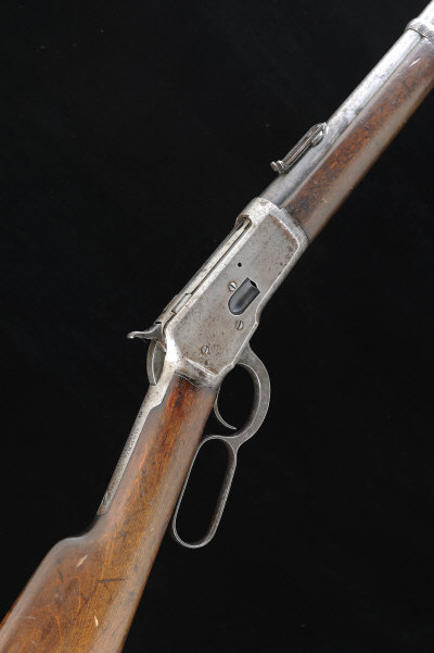 20-inch barrel with ladder rear sight, full length magazine tube, the receiver with saddle ring, 12 3/4-inch stock with steel butt plate, 5lb. 10oz., contemporary black powder proof, worn overall