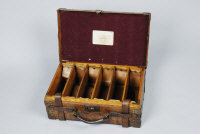 JOHN BLANCH & SON A LARGE BRASSBOUND OAK AND LEATHER CARTRIDGE MAGAZINE for approximately 500 cases, with leather straps and oak dividers |