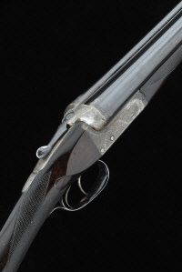CHARLES LANCASTER A 12-BORE BOXLOCK EJECTOR GUN, NO. 14347 29-inch barrels with 2 1/2-inch chambers about improved cylinder and 3/4 choke borings, top extension, the frame with fine scroll engraving and retaining much original hardening colour, 15-inch well figured stock, 6lb. 9oz., nitro proof, in its canvas case |