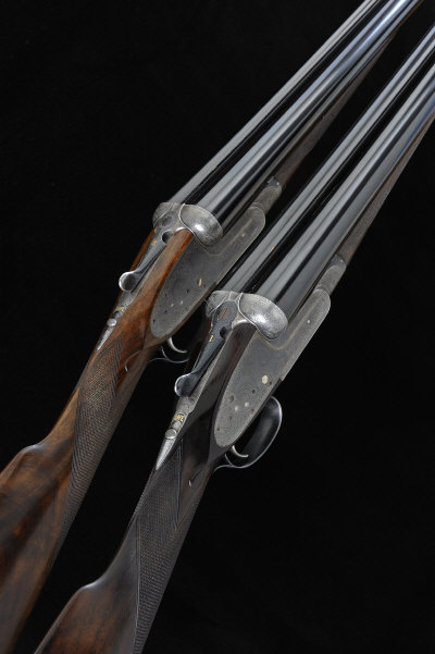 The maker confirms that the guns were built in 1912. The guns have been used by a father and son. The gun that has been re-stocked to fit the taller family member is easily shortened to match the original specificaton. |