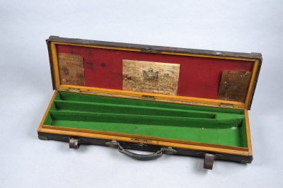 A BRASSBOUND OAK AND LEATHER GUN CASE the interior refitted for two pairs of barrels, 31 and 26 1/2-inches respectively, Holland & Holland label to the lid |