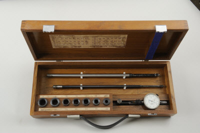 JOHN GIBBS A BORE MICROMETER GAUGE with two interchangeable probes to measure from 8-bore down to .410 calibre, in its maker's box with sizing rings |