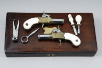 A PAIR OF MINIATURE REPRODUCTION PERCUSSION POCKET PISTOLS 1-inch turn-off barrels of approximaltey .25 calibre, with engraved muzzles, the brass frames with scroll engraving, central hammers and ivory grips, in a mahogany box with turnscrew, nipple key, bullet mould and barrel key