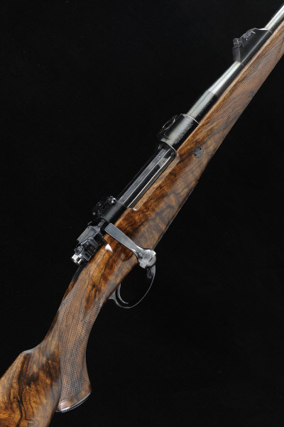 WILLIAM & SON A .300 WIN MAG BOLT ACTION SPORTING RIFLE, NO. 9011 24 1/2-inch barrel with raised fore sight with moon bead and folding hood, the raised rear sight with gold lined folding leaf to 150, the maker's name signed in gold, the receiver with quick detachable scope rings, the standard length bolt with side safety, recoil stud, the magazine with hinged base plate and profusely engraved with foliate scrollwork and signed by the engraver "Peter Cusack", the well figured half length stock with pistol grip, cheekpiece and leather covered recoil pad, sling swivels, 14 3/4-inch pull, 8lb. 10oz., nitro proof S1 The rifle appears new and unused. |