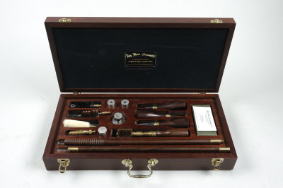 RAY WARD A SHOTGUN CLEANING KIT suitable for a 12-bore gun, the mahogany case containing cleaning rod, turnscrews, snap caps, oil bottle, etc |