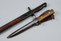 8-inch blade etched with the maker's name and address, smooth wooden grip, in its leather sheath; together with a bayonet for a P14 service rifle