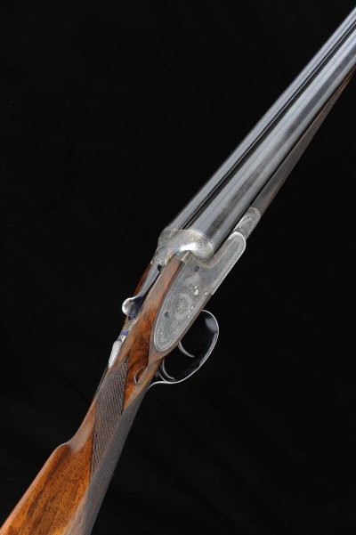ARMY & NAVY C.S.L. A FINE 12-BORE SIDELOCK EJECTOR GUN, NO. 57570 30-inch barrels with 2 1/2-inch chambers, about improved cylinder and full choke borings, the frame, back-action bar locks and top lever with fine bouquet and scroll engraving and retaining much original hardening colour, disc set strikers, 14 3/4-inch highly figured stock, 6lb. 8oz., nitro proof, lightweight leather case with maker's label |