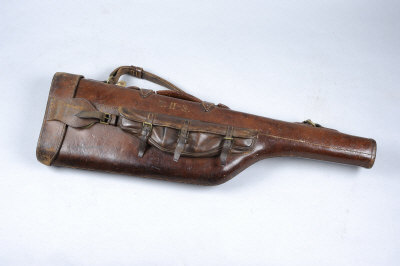 A LEATHER LEG-OF-MUTTON GUN CASE with compartment for 30-inch barrels, with external pouch for cleaning equipment |