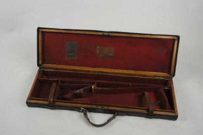 JAMES PURDEY & SONS A BRASSBOUND OAK AND LEATHER GUN CASE with compartment for 30-inch barrels, worn overall |
