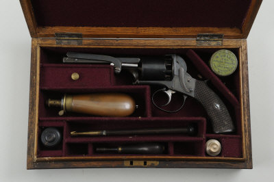4 1/2-inch barrel with loading lever, five-shot cylinder, the frame engraved on the right side "London Patent No. 35791", chequered grips, refinished overall, in its made-up case with powder flask, etc