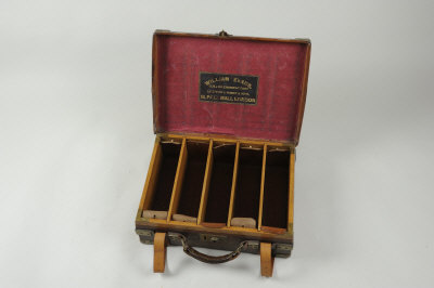 WILLIAM EVANS A BRASSBOUND OAK AND LEATHER CARTRIDGE MAGAZINE for about 250 cases, with leather lifters and oak dividers |