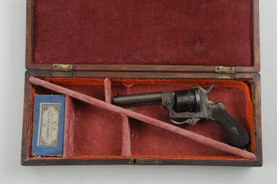 R. J. BATE A 7MM PINFIRE REVOLVER 3 1/4-inch barrel, the open frame with loading gate and folding burr trigger, retaining some original finish, chequerd walnut grips, contemporary Birmingham black powder proof, in its made-up case |