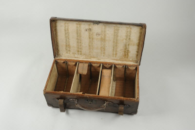 A LEATHER CARTRIDGE MAGAZINE for approximately 350 cases, with leather lifters and three dividers, three dividers missing, the lid impressed "Sir David Kinloch, Bart. Gilmerton" |