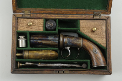 A PERCUSSION 120-BORE PEPPERBOX PISTOL 3-inch barrel, the frame and hammer with scroll engraving, refinished overall, smoothbore walnut grips, in its made-up case with accessories |