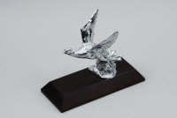 A MODERN CAR MASCOT in the form of a flying duck, chrome-plated, on its wooden plinth; together with a modern car mascot in the form of a bison; and a modern car mascot in the form of a warthog |