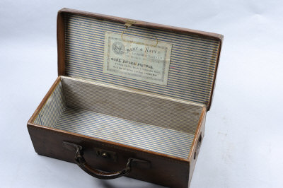 ARMY & NAVY A LEATHER CARTRIDGE CASE the lid with maker's label, the interior void of compartments, apparently to take cartridges or ammunition in their makers' boxes |