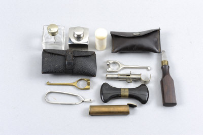 A GROUP OF SHOOTING ACCESSORIES comprising: 2 pull-throughs; 2 oil bottles; a striker pot; turnscrews; cartridge extractors, etc |