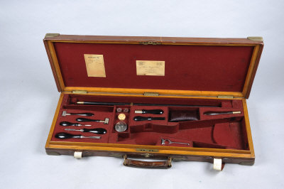 with compartment blocked for 27-inch barrels, suitable for a 16-bore gun, the interior fitted with tools and acccessories, many remaining