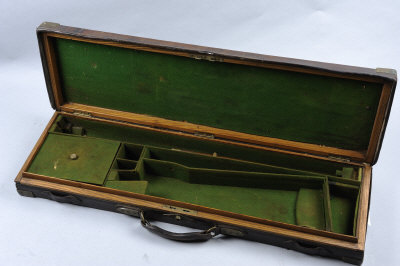 A BRASSBOUND OAK AND LEATHER GUN CASE with compartment for 30-inch barrels, maker's label removed, the exterior impressed 'B. G. Sackville-West' |