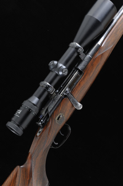 R. J. HARVEY A .30-06 CUSTOM BUILT BOLT-ACTION SPORTING RIFLE, NO. 1182 24-inch barrel, the Mannlicher receiver with bolt handle profusely engraved with fine scrollwork and mounted with a Zeiss Diavari-Z 3-12x56 telescopic sight in fixed mounts, side safety, the magazine base plate engraved with a roaring stag within scrollwork and retaining much original hardening colour, the half length highly figured stock with pistol grip, cheekpiece and rubber heel plate, double set triggers, sling swivels, 9lb. 12oz., nitro proof S1 The rifle appears little used and was built and finished to the highest quality. The engraving for the magazine base plate was designed by the artist Hans Bulder. |