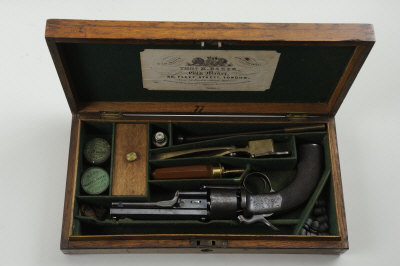 THOMAS BAKER A 60-BORE LONG SPUR PERCUSSION REVOLVER 5-inch octagonal barrel with spring-loaded loading lever, the top surface signed "Thomas K. Baker, 88 Fleet Street, London", six-shot gastight cylinder, the frame and long spur hammer with scroll engraving and retaining much original finish overall, chequered walnut grips, London black powder proof, in its maker's oak case with powder flask, mould, etc, together with paperwork relating to 8th Cinque Ports, Rifle Volunteers, Prize Contest, dated 1863-1868. |