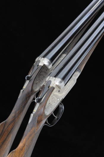 COGSWELL & HARRISON A PAIR OF 12-BORE "EXTRA QUALITY VICTOR" SIDELOCK EJECTOR GUNS, NOS. 44891/2 30-inch Argus steel barrels with 2 1/2-inch chambers about improved cylinder and 1/4 choke borings, mid extension, the frames, locks and top levers with bouquet and scroll engraving, 14-inch figured stock with ribbed butt plate, 6lb. 10oz., nitro proof, No.2 gun top lever spring weak, in their brassbound oak and leather case embossed Prince Nicolas Galitzine