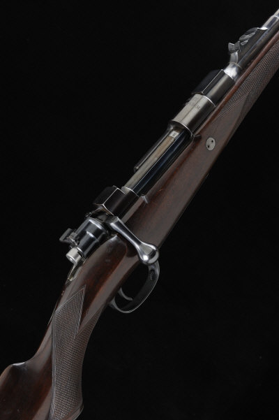 JOHN RIGBY & CO. A .350 MAGNUM BOLT-ACTION SPORTING RIFLE, NO. 5474 24-inch barrel with raised fore sight, the rear sight with folding leaves to 400 yds, the barrel, bolt and receiver all bearing the Mauser serial number 92597, square bridge magnum receiver, bolt with flag safety, magazine with hinged base plate, the half length stock with pistol grip and perished rubber recoil pad, recoil stud and sling eyes, 15-inch pull, 8lb. 11oz., nitro proof S1 The maker confirms that the rifle was built in 1931 and that the rifle was cleaned and the metalwork re-blacked in 1991. It has remained in the same family from new. |