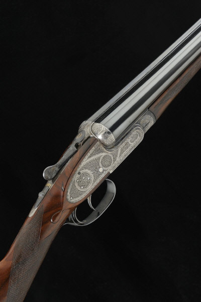 AYA A 12-BORE NO.1 MODEL SIDELOCK EJECTOR GUN, NO. 487768 28-inch chopper-lump barrels with 2 3/4-inch chambers, about recessed and 1/2 choke borings, the frame, hand detachable lock and top lever with bouquet and scroll engraving and retaining traces of original hardening colour, gold lined cocking indicators, articulated front trigger, rolled edge trigger guard, 14 3/4-inch well figured stock, 6lb. 9oz., Spanish nitro proof, vinyl covered case S2 |